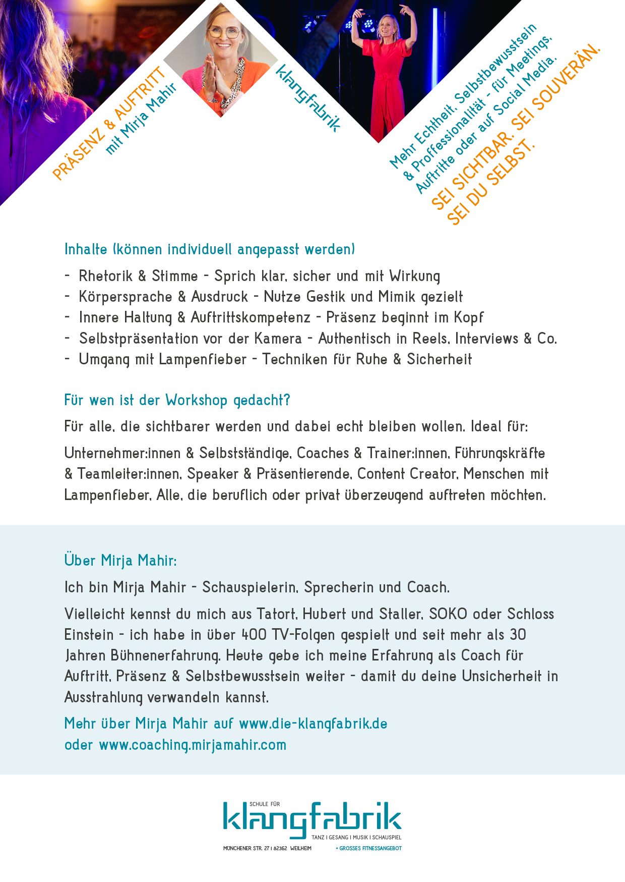 In diesem praxisnahen Workshop mit Schauspielerin und Mediencoach Mirja Mahir lernst du, wie du authentisch, präsent und professionell auftrittst – in Meetings, auf der Bühne oder auf Social Media.